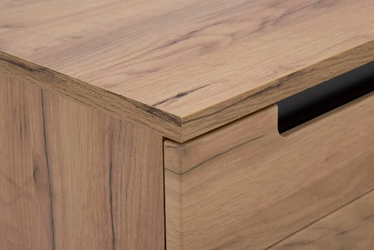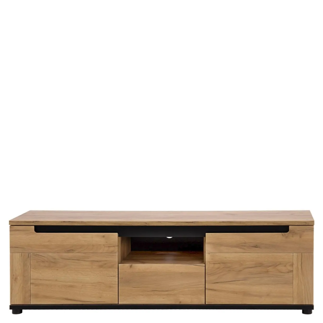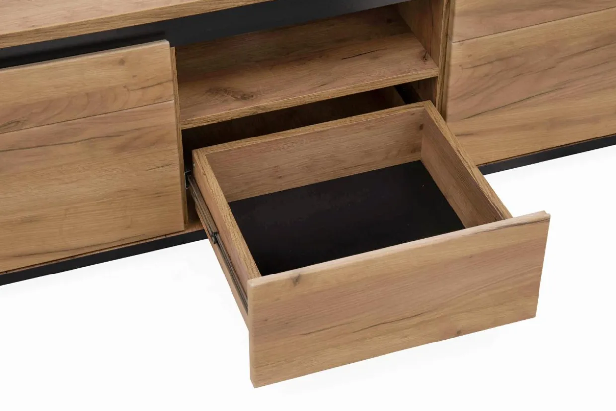 Nowoczesny design RTV PRISCO cechują wyważone elementy dekoracyjne oraz kolorystyka, która łączy wybarwienie złotego dąbu craft z czarnym kolorem.