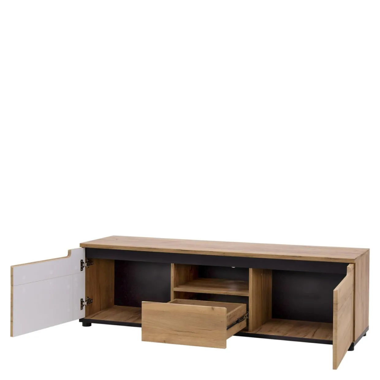 - RTV posiada 2 zamykane szafki – 2 wnęki idealne do przechowywania płyt i akcesoriów