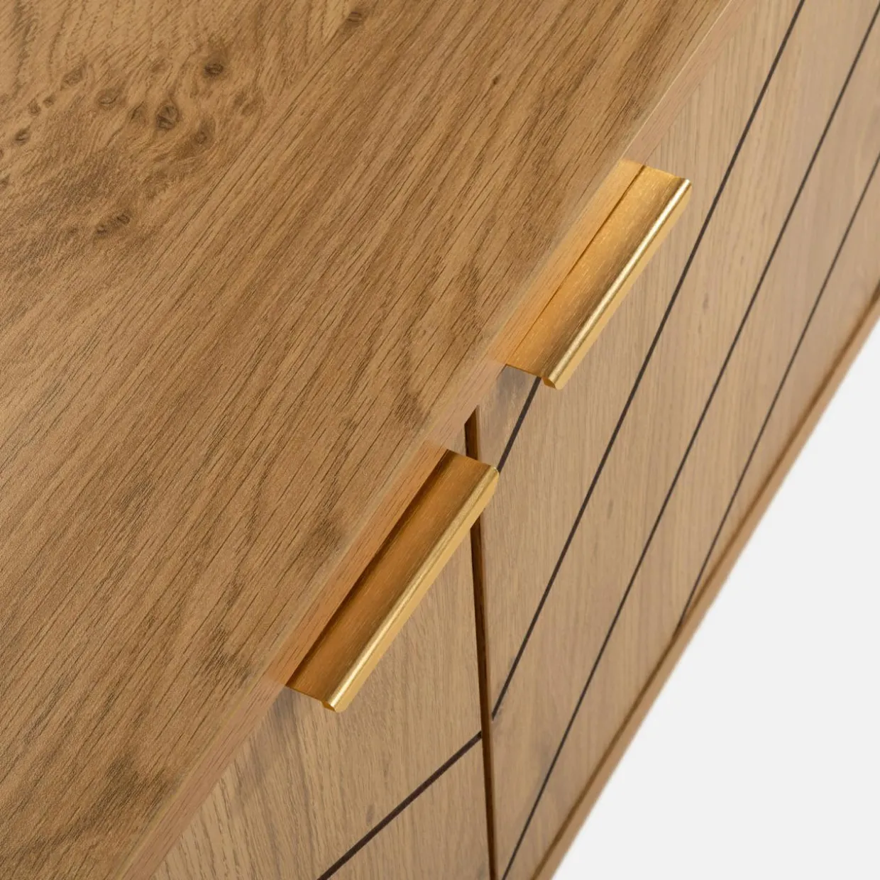 - Uchwyty i nogi w barwach podobnych do mebli dodatkowo podkreślają ciepły kolor wykończenia.