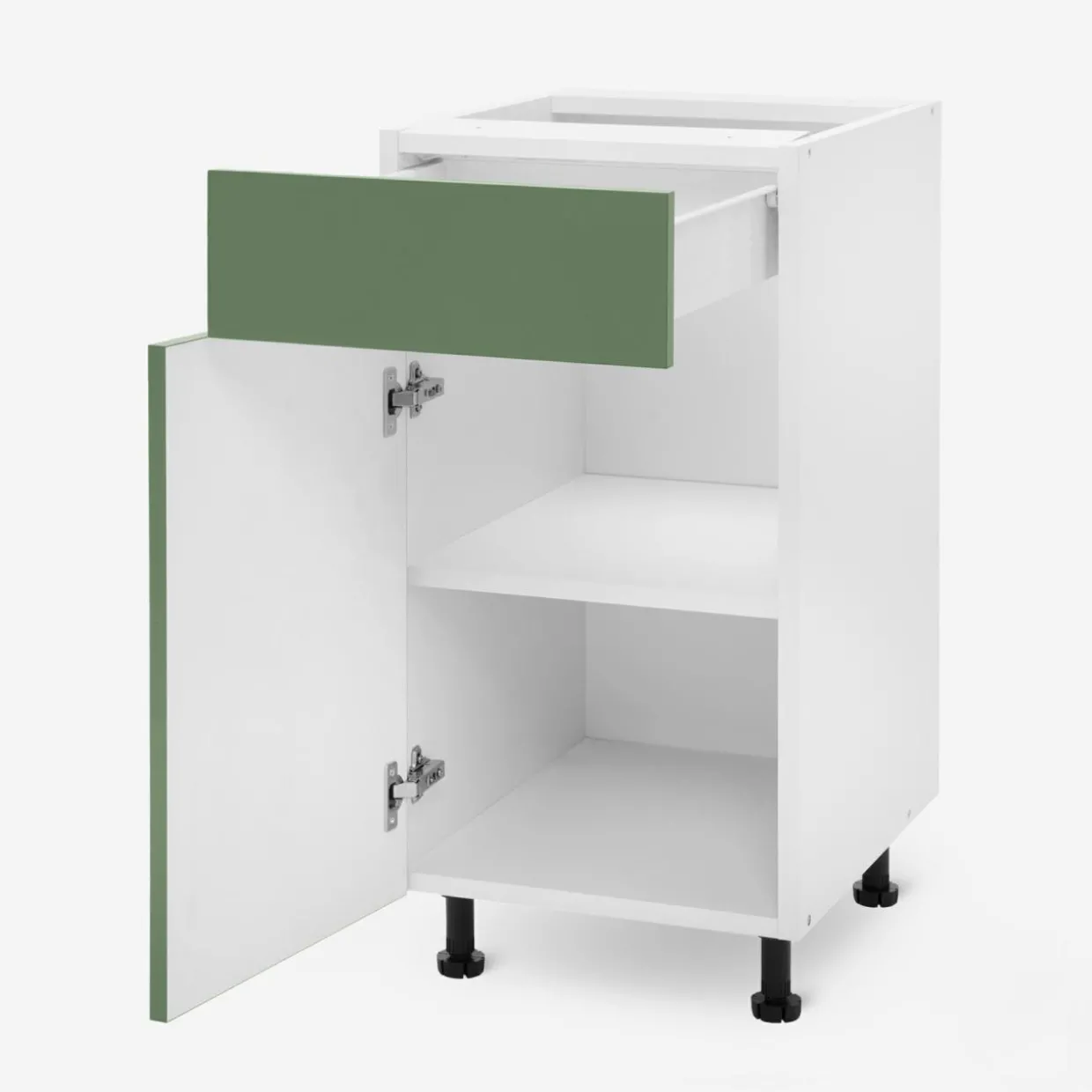 - Szafka podzielona jest na szufladę i szafkę z półką. Pozwala na oddzielenie drobnych sztućców i akcesoriów od garnków.