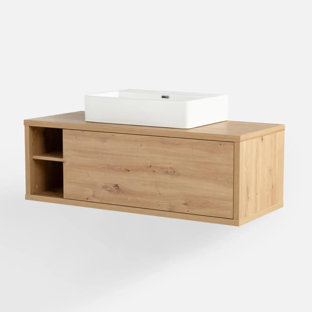- Na półkach umieścisz mniejsze kosmetyki, a większe opakowania schowasz wewnątrz szafek. Półki oraz front szuflady mają grubość 16 mm.