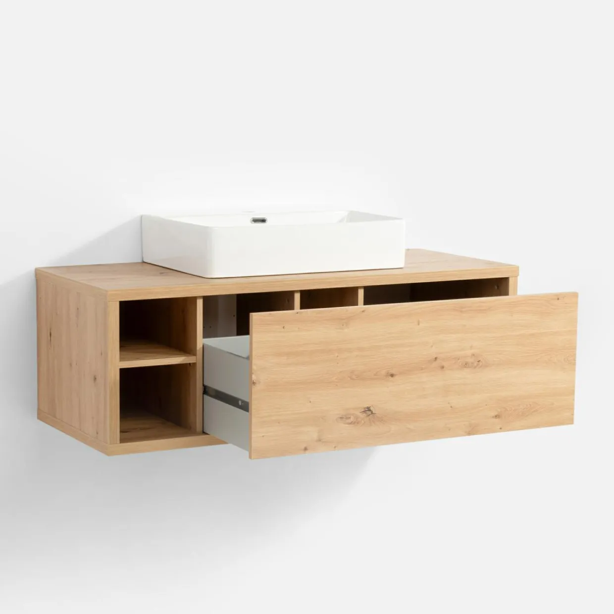 - Posiada szufladę oraz umieszczone obok niej 2 wnęki – idealnie dopasowane do przechowywania drobiazgów potrzebnych przy codziennej toalecie.