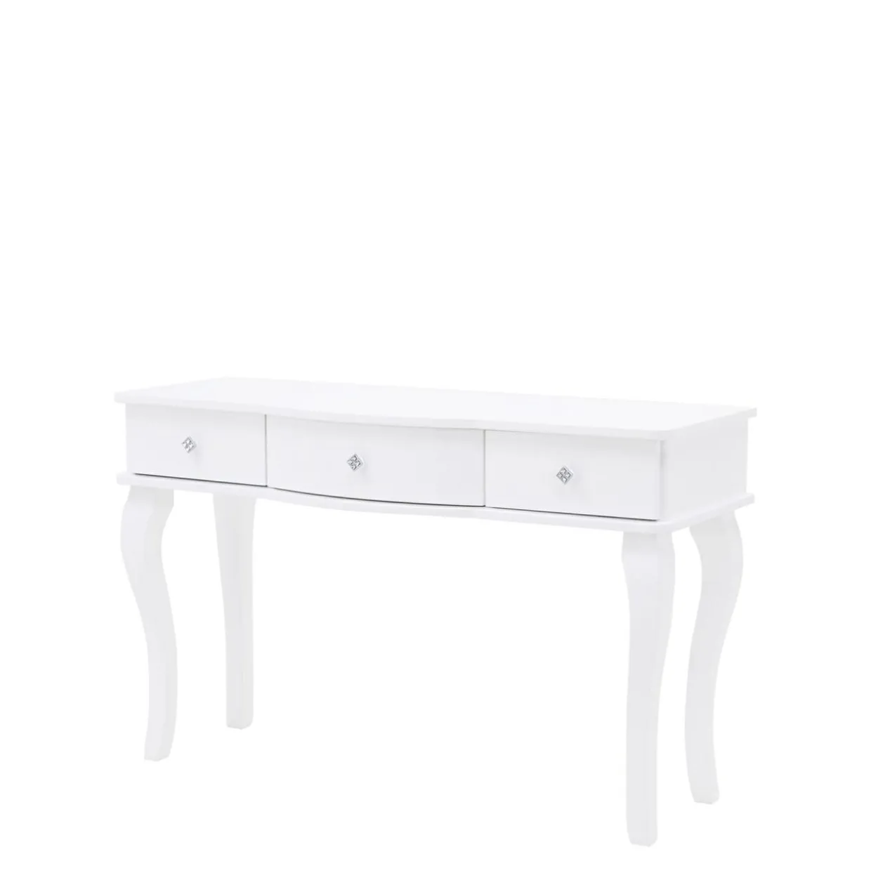 Toaletka została wykończona białym lakierem w wysokim połysku, ozdobne nóżki są wykonane z litego drewna, uchwyt jest zdobiony kryształkami.