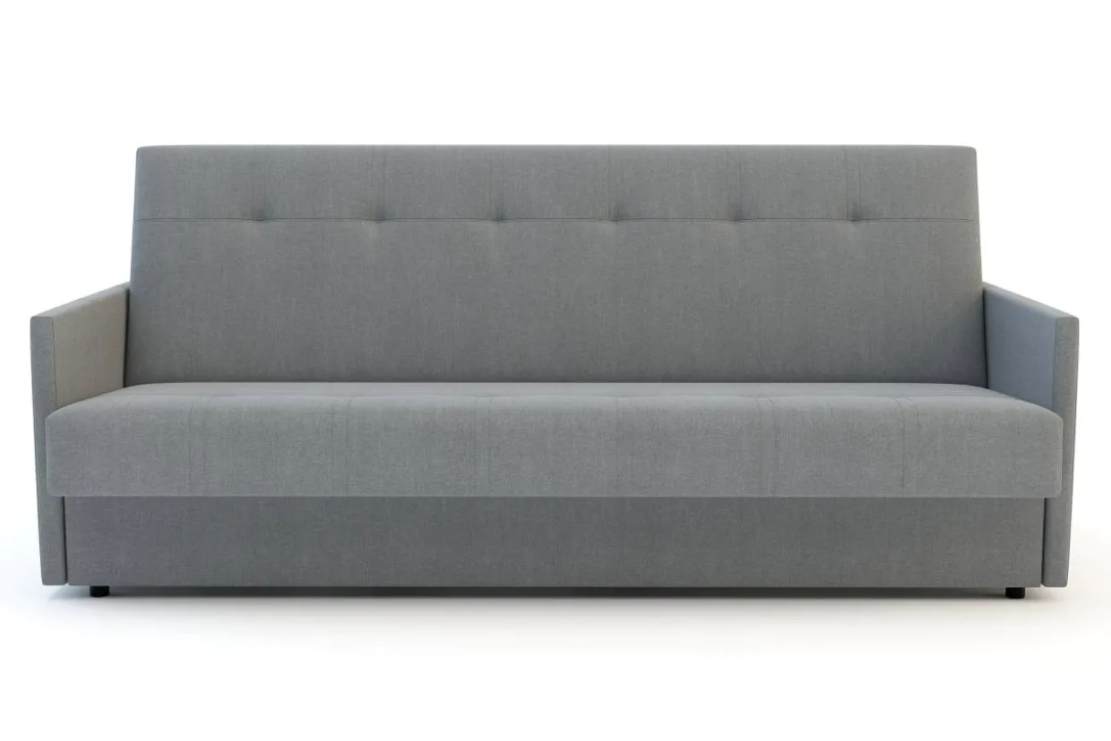Ma wąskie podłokietniki i ozdobne wciągi na oparciu i siedzisku – dzięki temu wygląda jak tradycyjna sofa.