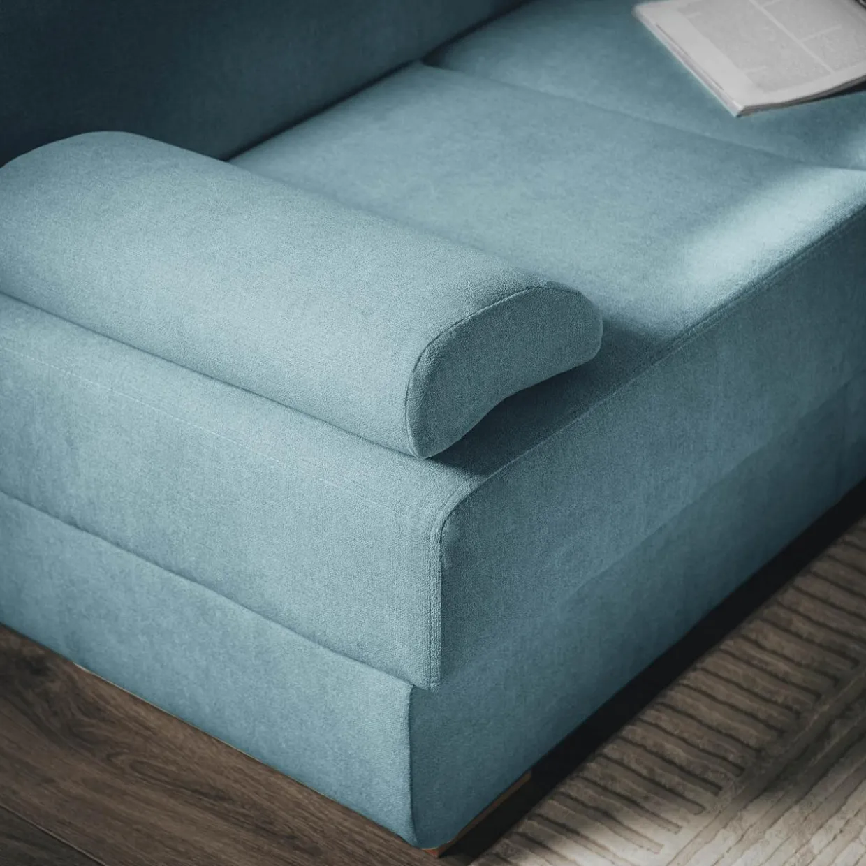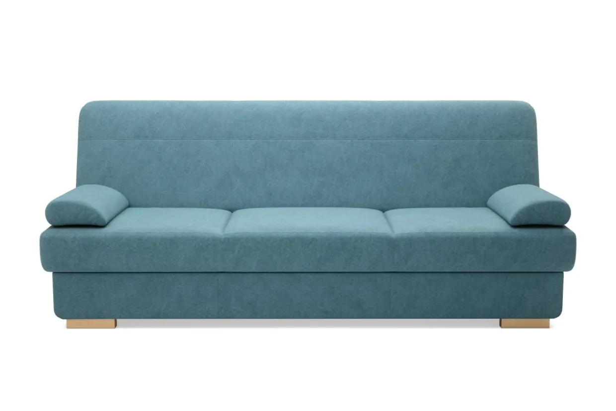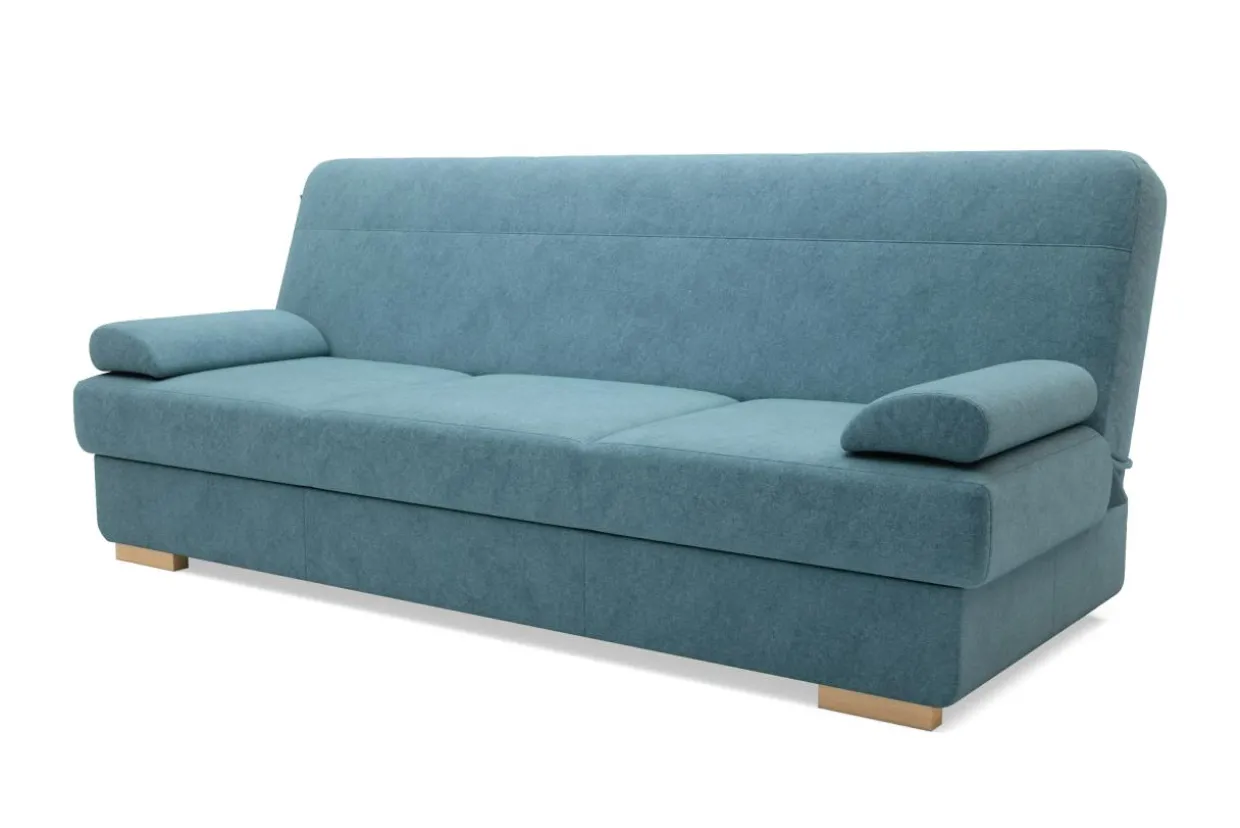 Zamiast stałych podłokietników wykorzystano miękko wypełnione poduszki podłokietnikowe, których ściągnięcie zwiększa powierzchnię spania czy siedzenia. Poduszki te są dobre także pod głowę lub plecy. Zarówno stelaż jak i nóżki wykonano z drewna dzięki czemu mebel jest bardziej naturalny.