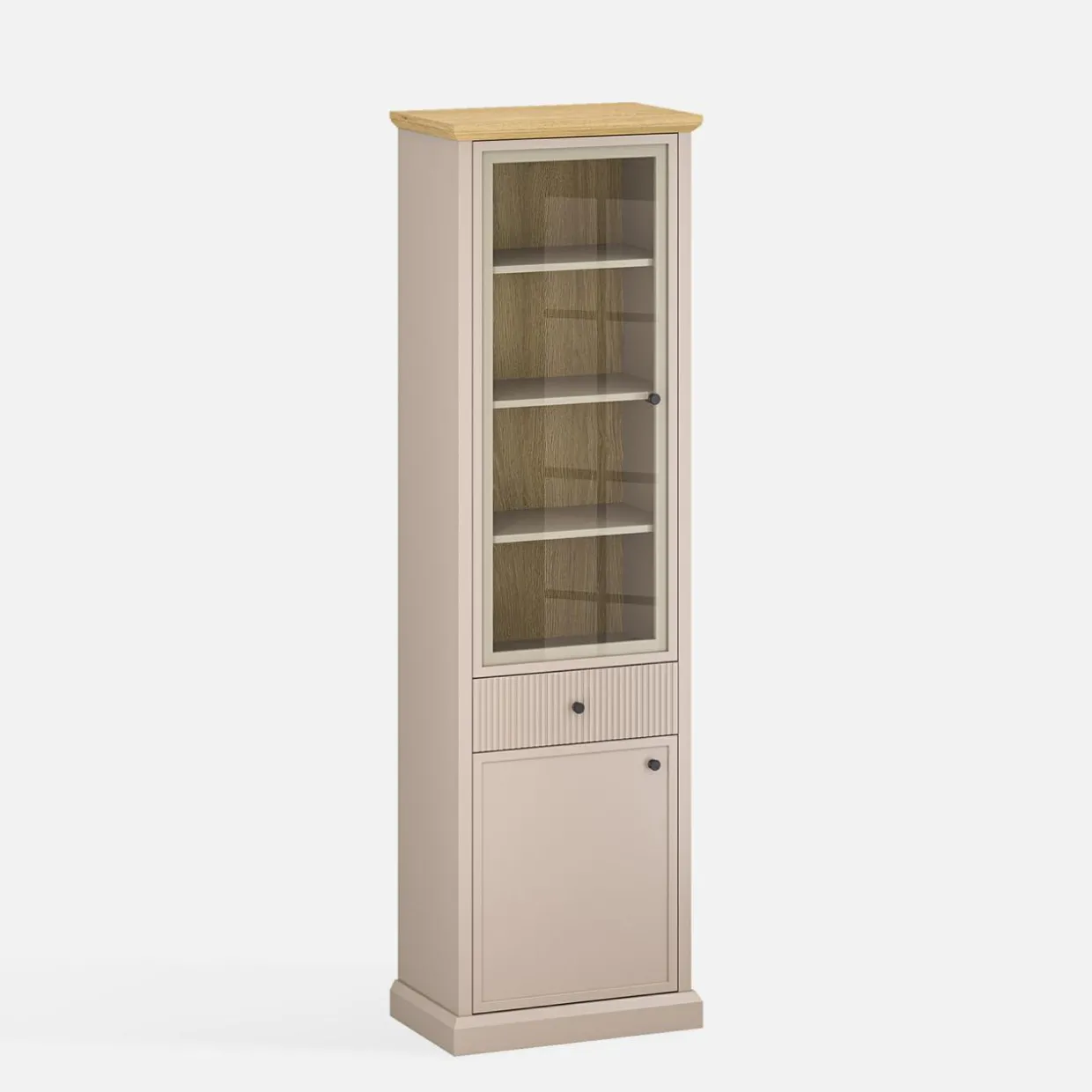Witryna wysoka IDELLO w odcieniach taupe i dębu kamiennego to idealne miejsce do wyeksponowania porcelanowej zastawy, pamiątek z wakacji lub innych ulubionych przedmiotów.
