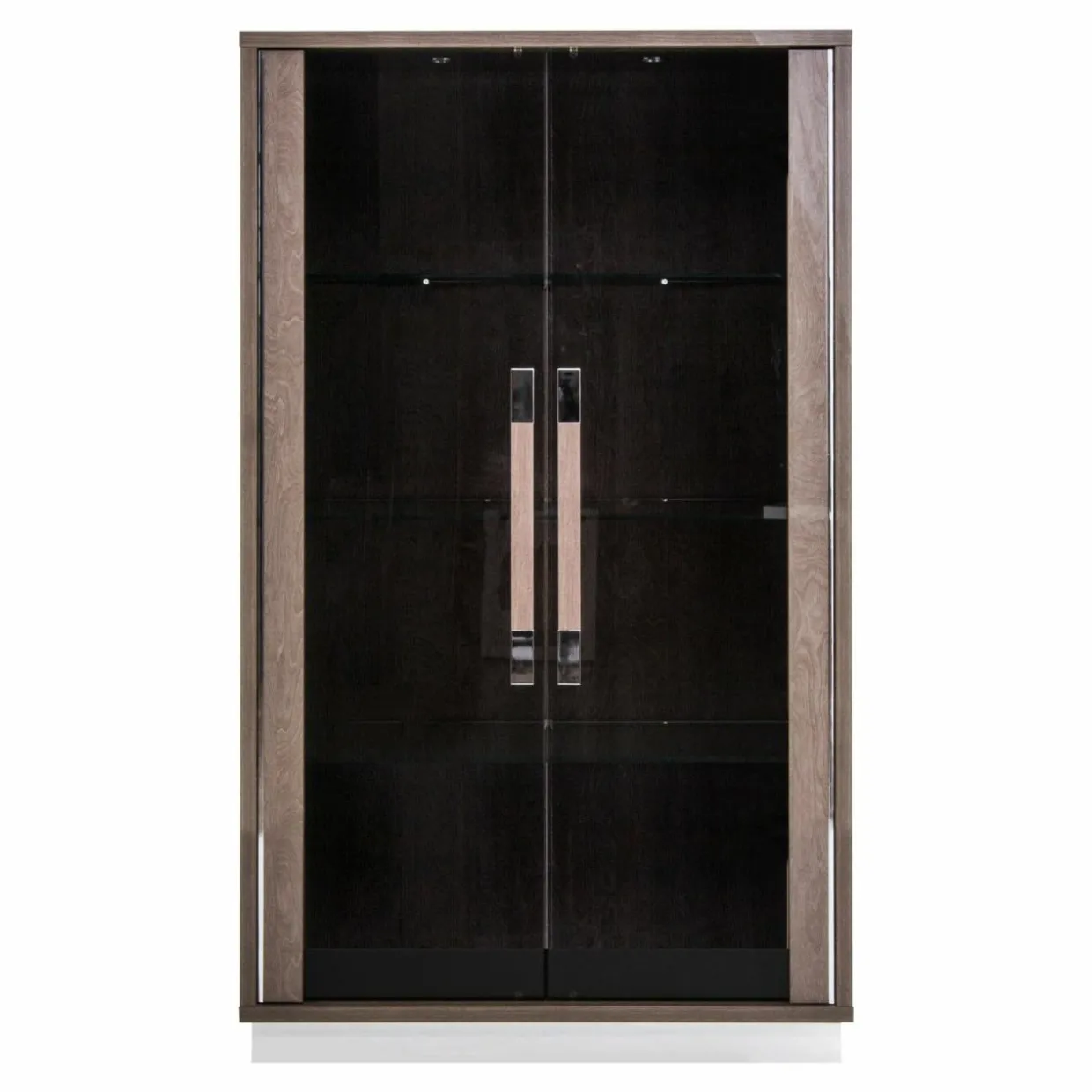 Płyta meblowa, z której zostały wykonane elementy witryny jest pokryta półbłyszczącą powłoką w kolorze srebrna brzoza.