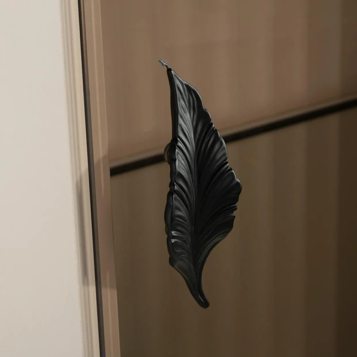 - Nietuzinkowe uchwyty z liściem pełnią rolę funkcjonalną, ale także stanowią ozdobę pomieszczenia. Ciemne, metalowe listki wyróżniają na tle frontów w odcieniach savany i kaszmiru.