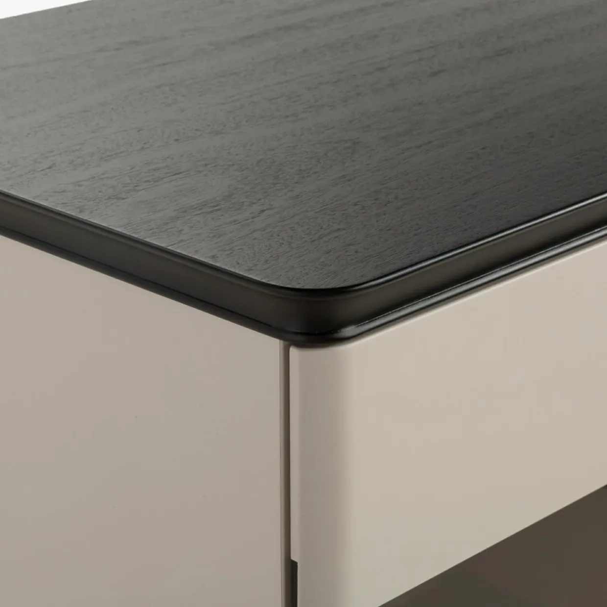 - Blaty mebli wykończone są okleiną w odcieniu mahoniu szczotkowanego, który podkreśla klasyczny design.