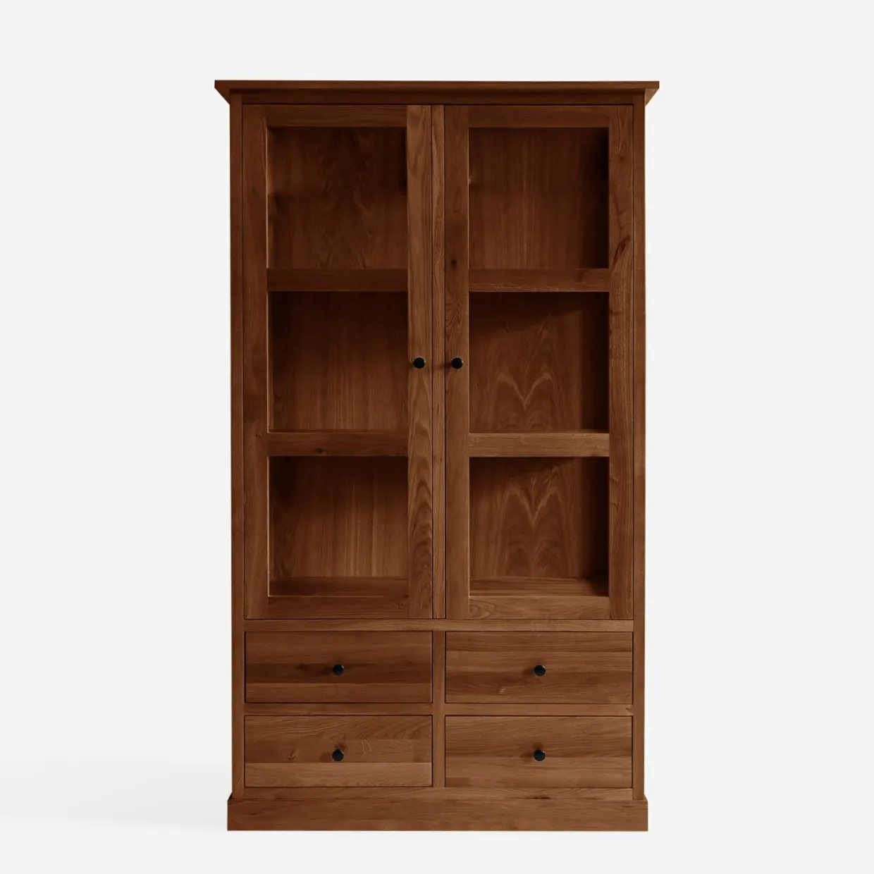 Witryna STELLA to praktyczny mebel, wykonany z litego drewna w odcieniu dąb koniakowy. Dzięki 4 szufladom oraz przeszklonym półkom, łączy wygodę przechowywania z estetyką ekspozycji. Jest idealnym wyborem do salonu, jadalni lub gabinetu.