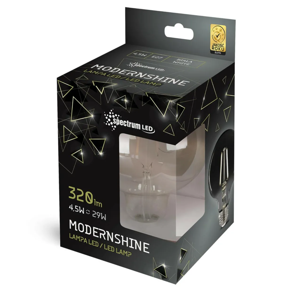 Żarówki z serii MODERNSHINE idealnie pasują do lamp stołowych, wiszących, sufitowych i podłogowych. Zużywają mało energii – 5 kWh/1000h a ich niespotykany design obejmujący przydymione szkło oraz widoczne filamenty znacząco podwyższa atrakcyjność wizualną. Ze względu na wielkość nadają się do lamp pozbawionych kloszy.