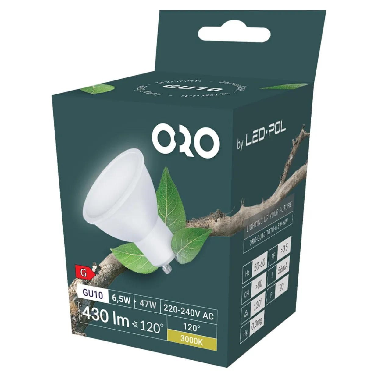 ORO-GU10-TOTO-6,5W-WW charakteryzuje się także bardzo dużą wytrzymałością oraz długą żywotnością (20000 godzin). Emituje ciepłe światło o temperaturze barwowej 3000K.