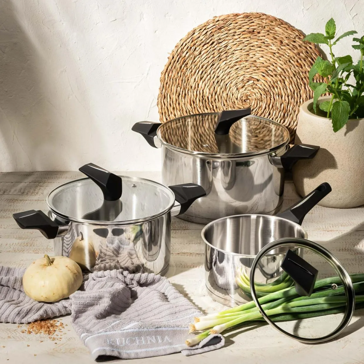 Zestaw garnków ze stali nierdzewnej TRESO uzupełni wystrój nowoczesnej kuchni. Użyjesz ich na wszystkich typach kuchenek, w tym na indukcji.