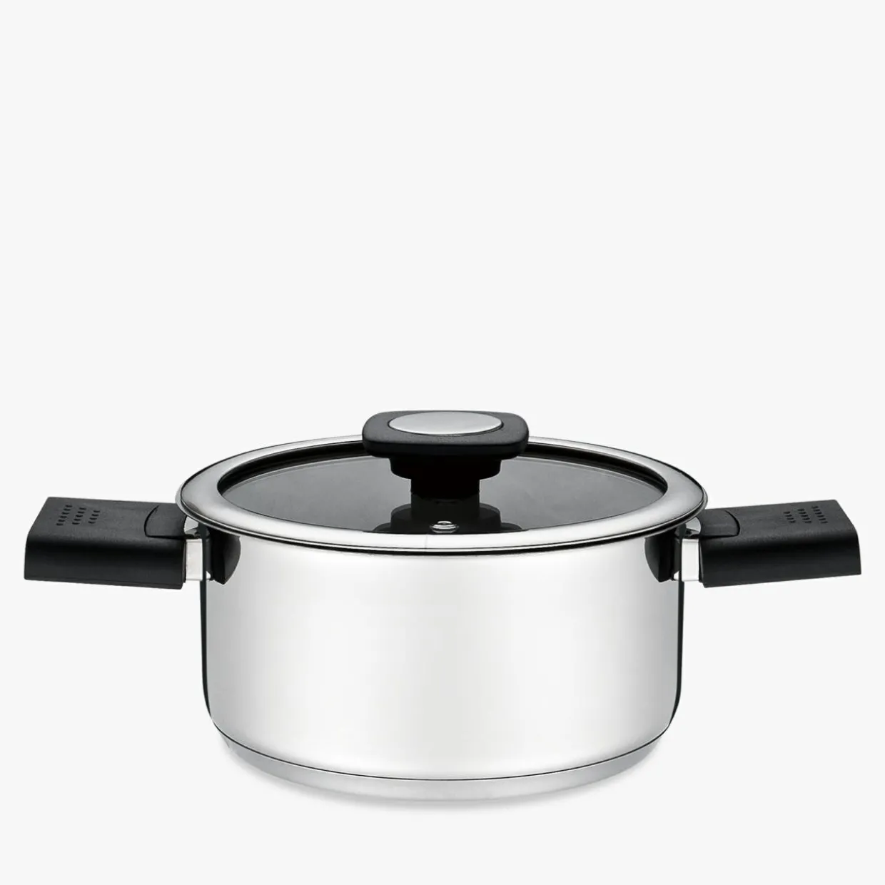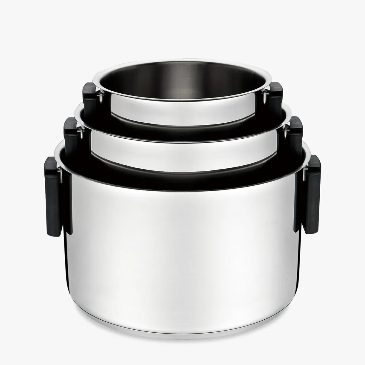 Składane uchwyty pozwalają włożyć mniejsze garnki w większy rozmiar – trzymasz jeden komplet w jednym miejscu.