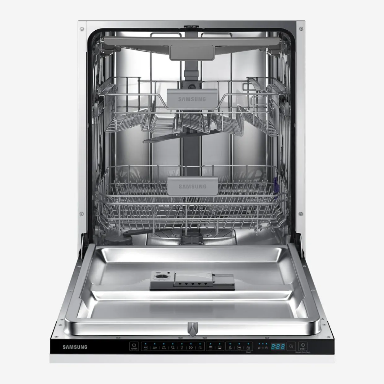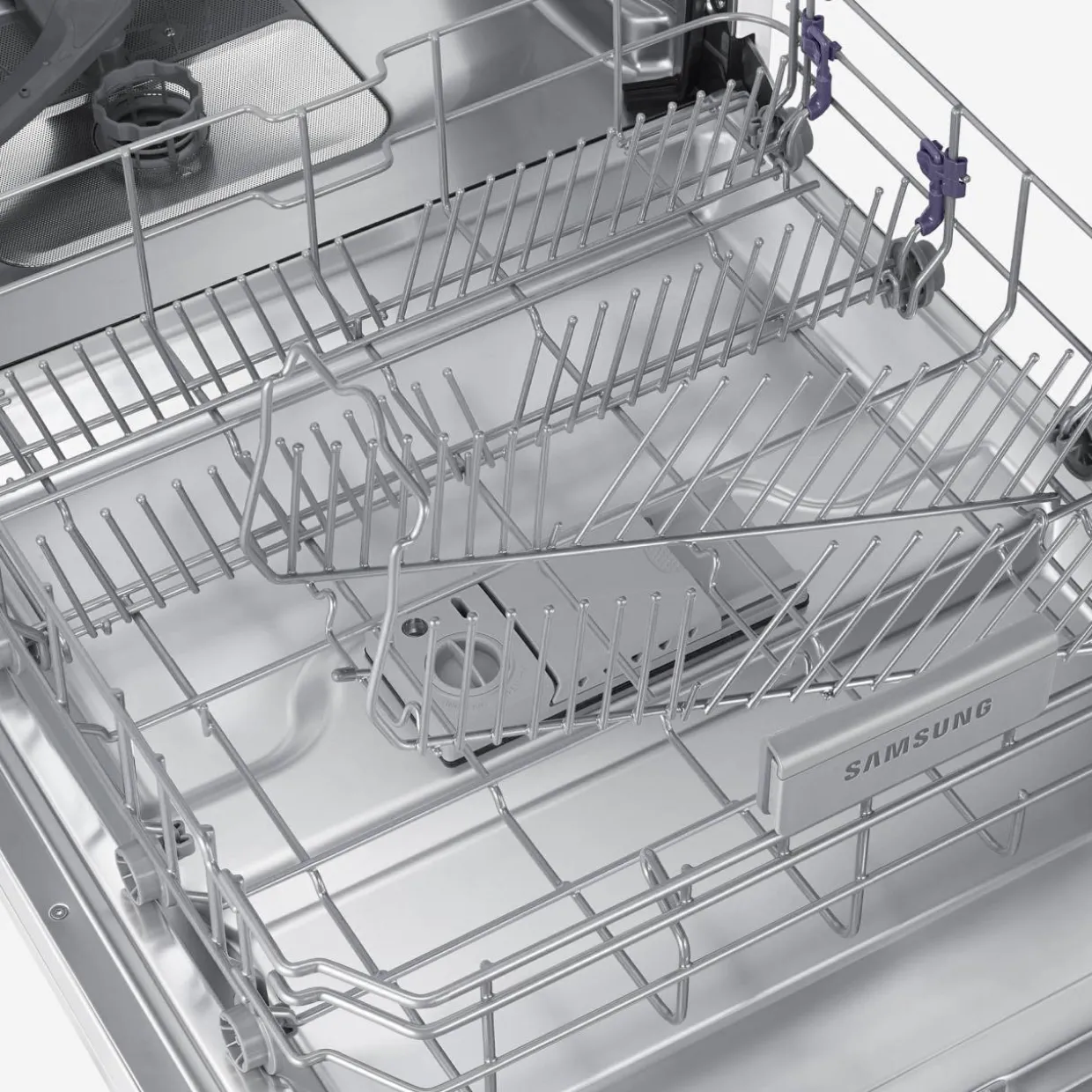 - Ramiona spryskujące na trzech poziomach – zapewniają dokładne mycie wszystkich naczyń.