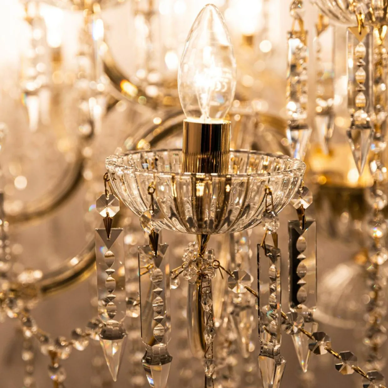 - Połyskujące, złote wykończenie i elementy ze szkła i tworzą piękna oprawę dla żarówek.